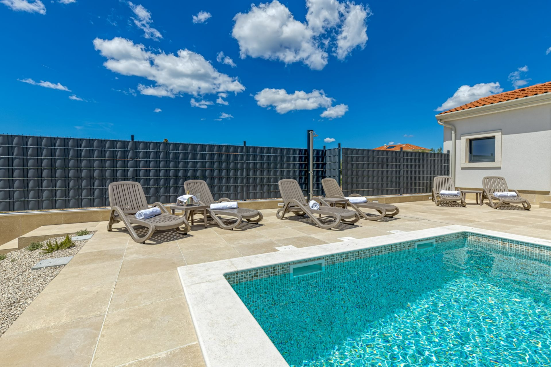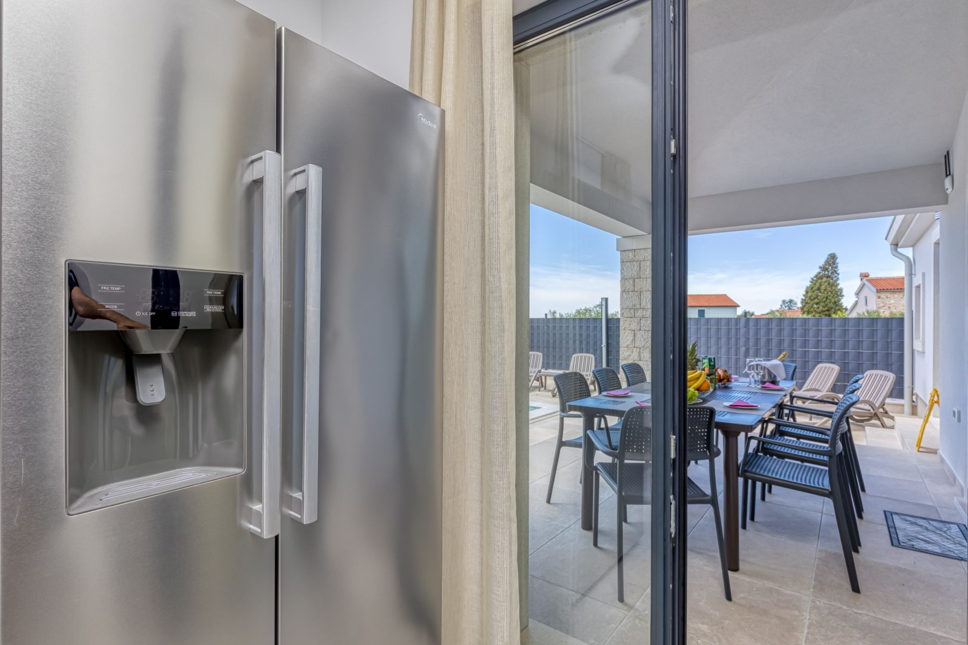 Im Außenbereich erwartet Sie eine großzügige, überdachte Terrasse mit einem großen Esstisch, die zu geselligen Grillabenden im Freien einlädt. Das Herzstück des Gartens ist der private Swimmingpool, der an heißen istrischen Sommertagen für die nötige Abkühlung sorgt und Ihren Aufenthalt in der Villa Istria perfekt abrundet.