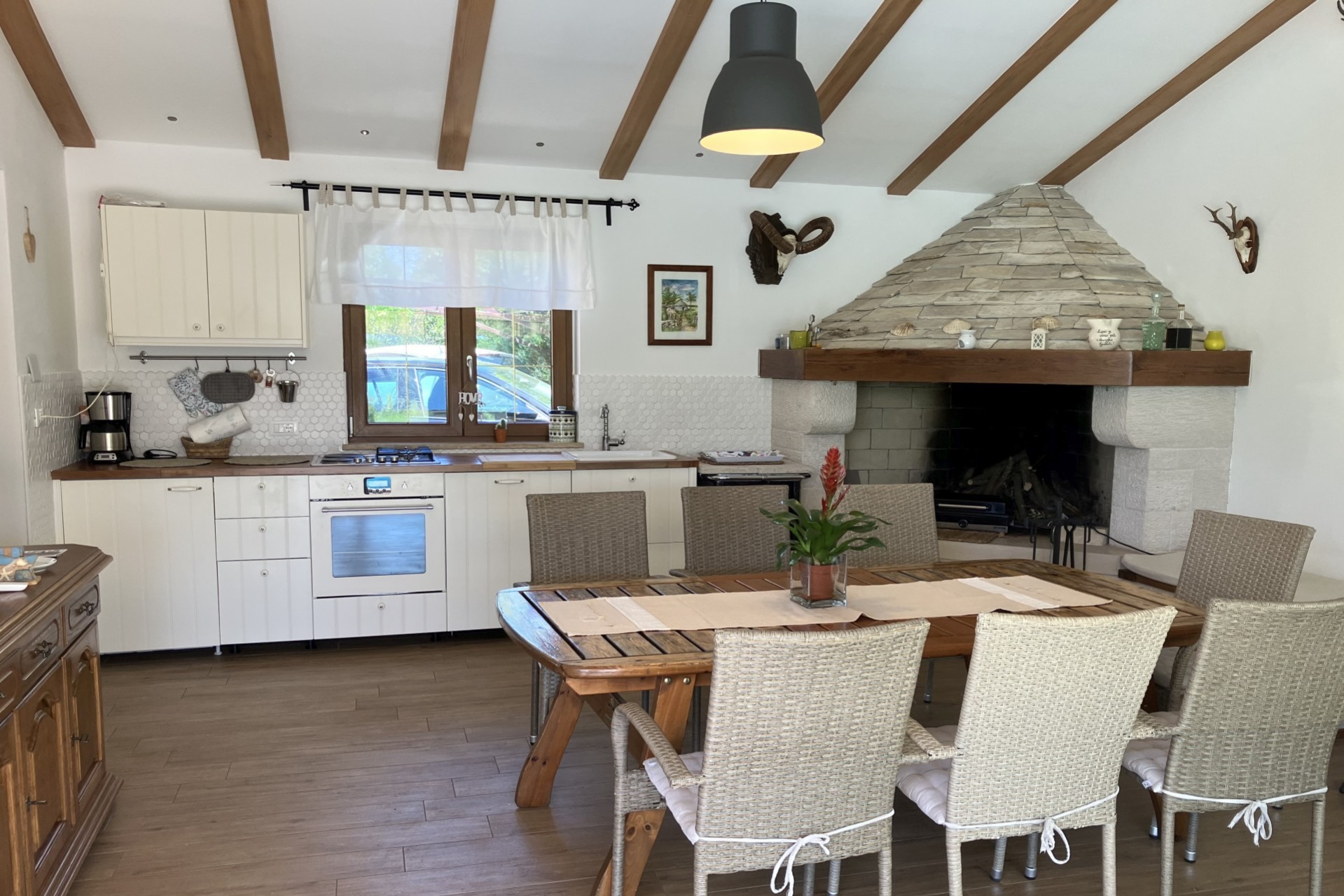 The house and the 32 m² pool are surrounded by a well-kept garden. In the associated pool house is another fully equipped kitchen (including dishwasher) with TV, a large fireplace and a guest toilet.